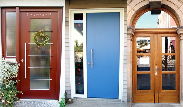 Haustüren in verschiedenen Farben und Formen, in historischen wie modernen Stilen.